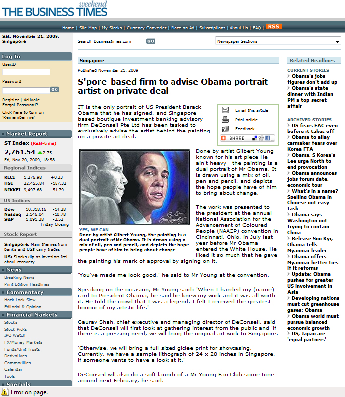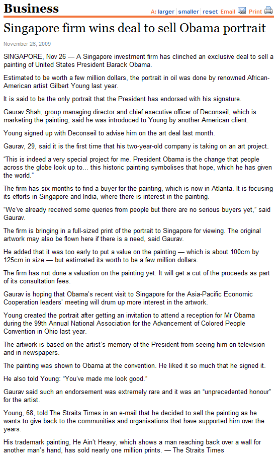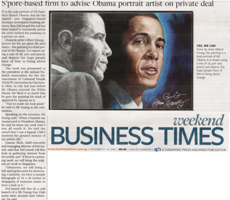 Singapore art market features unique Obama portrait investment project managed by Deconseil's Gaurav Shah.
